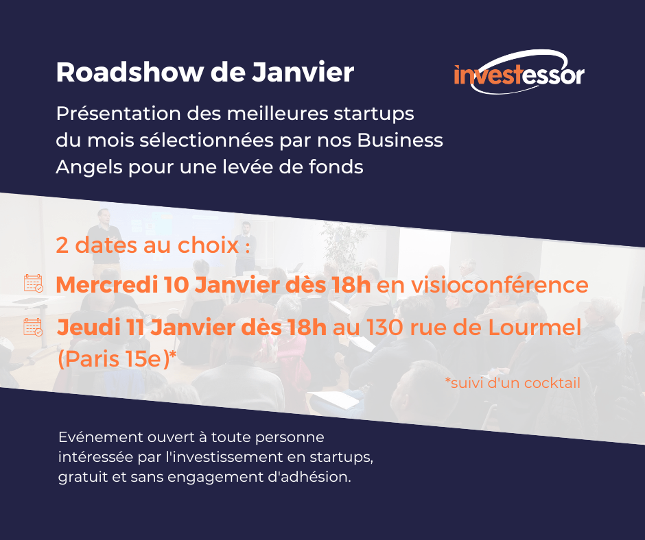 L’association de Business Angels Investessor vous invite à son Roadshow Mensuel, étape phare de l’entrée en levée de fonds de startups sélectionnées par ses membres.